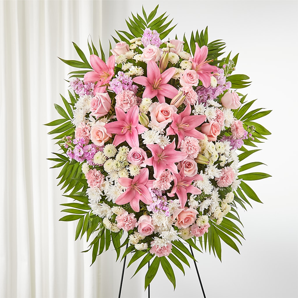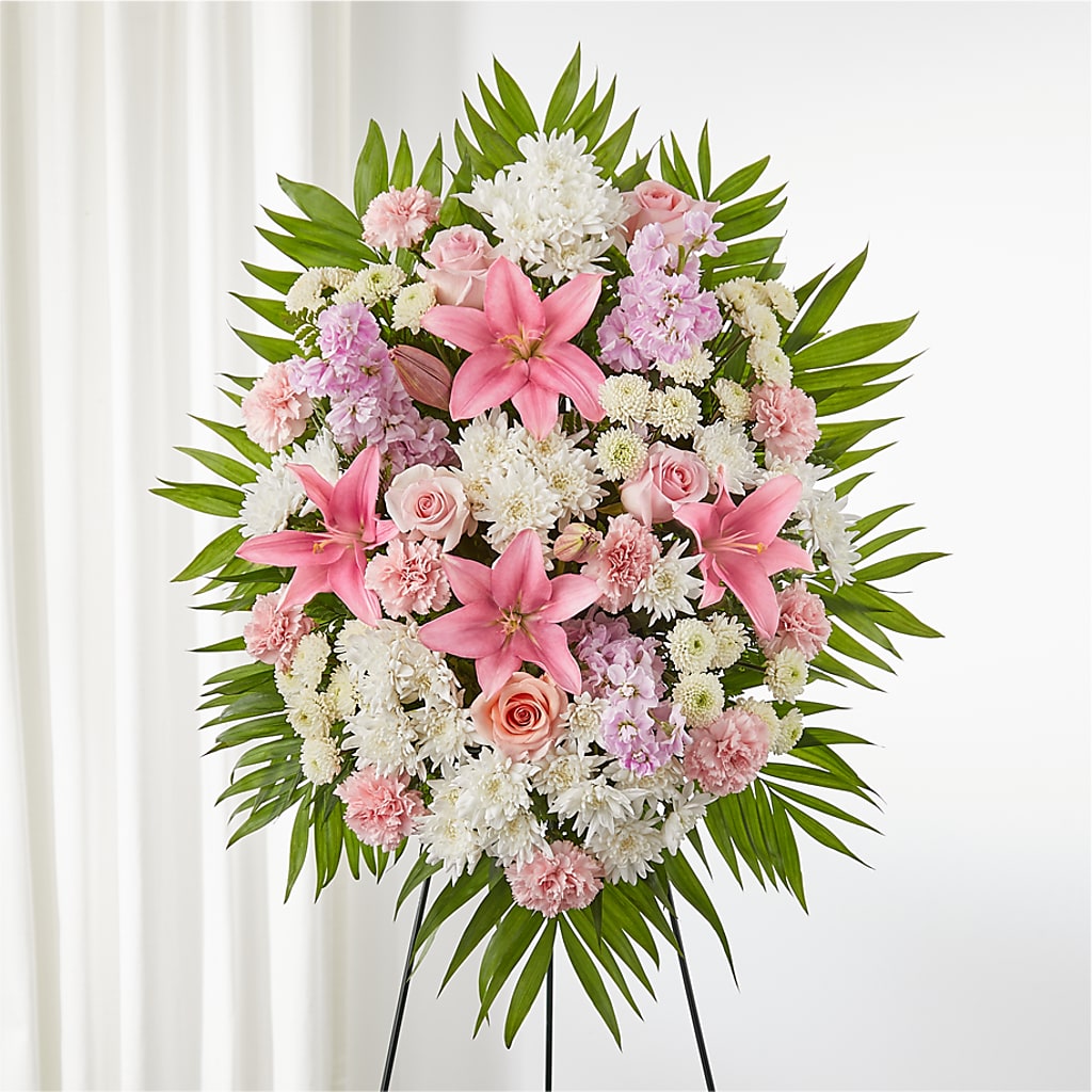 Artfully arranged pink and white florals create a captivating standing spray to honor a beautiful life.